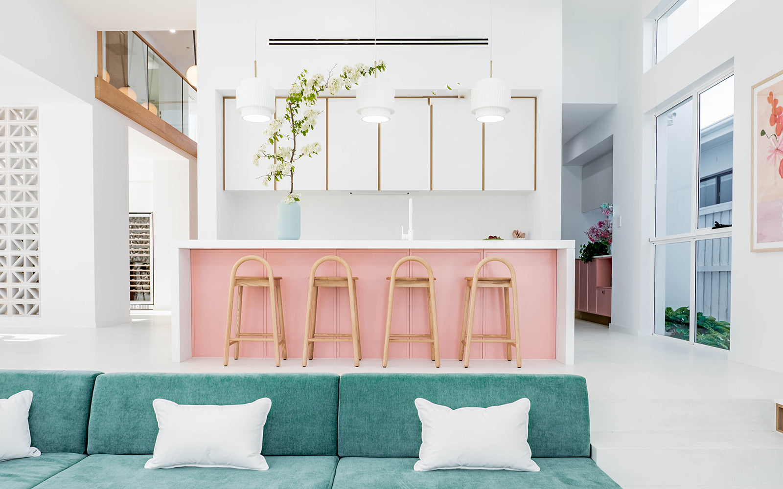 If you have a smaller, open-plan space, you may choose to save the bold feature piece for the dining table. In this case, surface mounted "can" down lights can be a good choice to define the kitchen zone without overcrowding the room.
