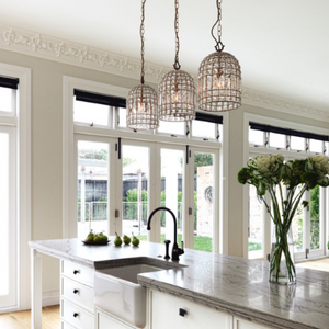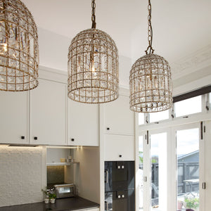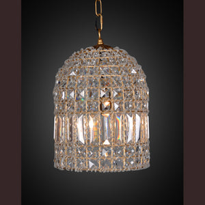 Graceful pendant light suitable for any classical room. Beaded Gold finished frame with inset crystals.
