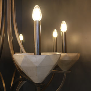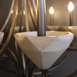 The Benedetta chandelier is a rustic-industrial take on the chandelier. The frame is a warm Antique Iron/Bronze finish with candle cupholders crafted from cast cement.  Perfect in an industrial, contemporary, or country setting.