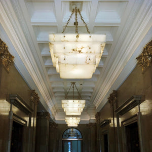 This stunning style is an example of our custom-made designs, inspired by the Art Deco apartment building these were commissioned for. Made in real Alabaster stone with solid Antique Brass detailing, these give a sense of authentic vintage style.