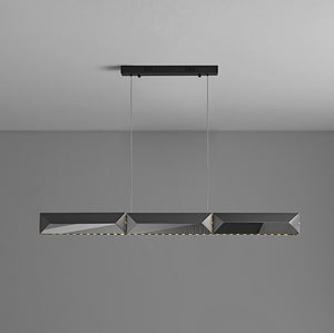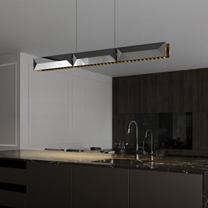 The Eko pendant is a unique take on the horizontal pendant, featuring grand-scale K9 faceted crystals facing out to the room. Brass finish interior panels provide depth and detailing.