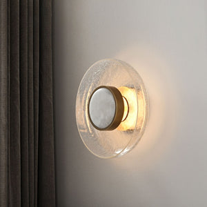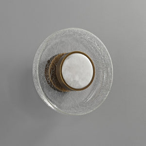 A unique contemporary wall sconce with crackle texture glass around an Antique Brass finished fitting with Spanish Marble central detail. Integrated LED backlit light.