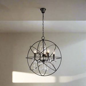 A modern twist on a timeless classic, this unique chandelier features an iron globe casing around the crystal chandelier. A fantastic feature light for any modern, farmhouse, or transitional style space.
