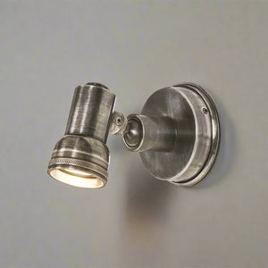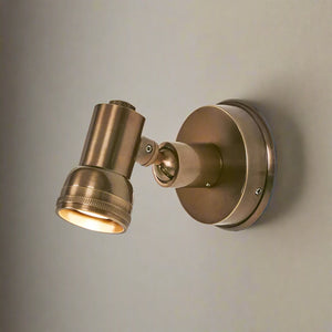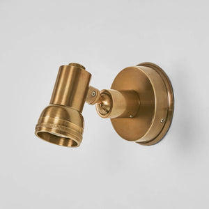 The Justin wall light is an adjustable spotlight with unique character. Handmade in solid brass with unlacquered finishes designed to deepen over time.