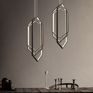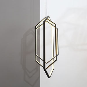 The Puntada pendant light is a stunning contemporary pendant, featuring three elongated hexagonal forms suspended together. A minimalist statement in any space. Gunmetal frame with integrated LED.