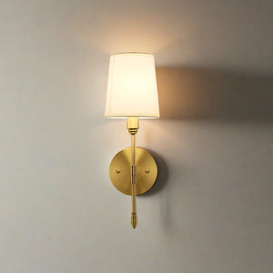 Seth is a classic wall sconce style with an understated flair. Seth features a fabric shade and brushed brass. Shade included.
