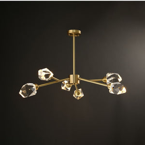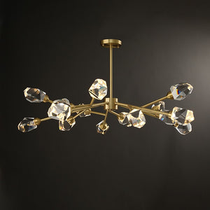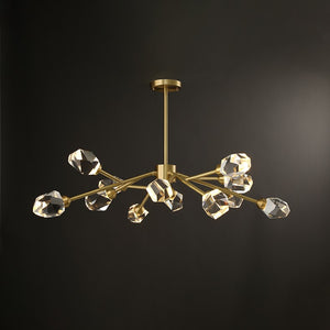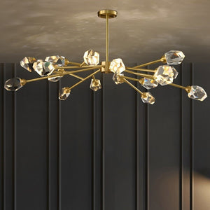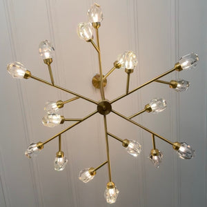 Tora is a dazzling contemporary pendant light with glowing faceted crystals on an asymmetric polished brass frame. Designed to sit close to the ceiling to allow ample head height underneath.