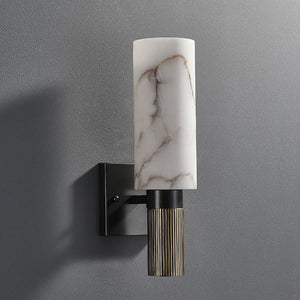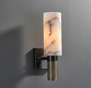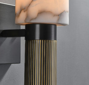 A contemporary twist on a classic Alabaster stone wall sconce, the Achilles wall light features a black bracket with gold accents, and a warm inner glow through the stone shade.