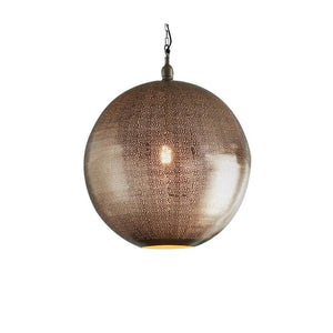 A modern take on the Moroccan style light. The small perforations in the shade create a glowing pattern on the pendant, and diffuse light softly throughout the room. The Nickel finish transforms into a soft golden glow when lit by a warm bulb.