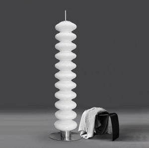 The Arble floor lamp features a ridged gloss White handmade glass silhouette on a Chrome frame, inspired by the style of the '60s.