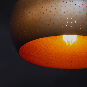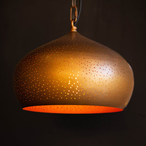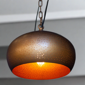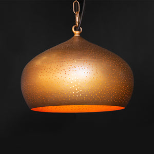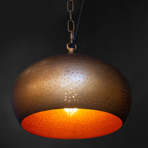 The Aya pendant light features a tapering dome shade in a Moroccan-inspired style. With handmade perforations glowing through the vintaged Antique Brass finish shade, Aya adds a soft dramatic effect to any space.