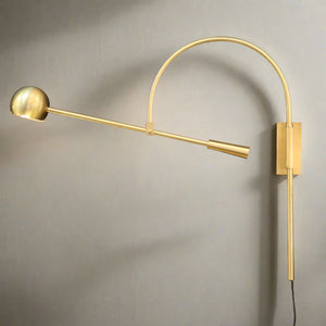 Crafted in brushed Brass, the adjustable tilting arm ends in a round shade that can be swung out or against the wall when needed. Plug in, can be adjusted to suit hardwiring if required.