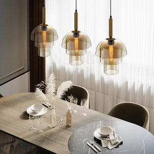The Elba pendant is a tinted tiered glass pendant with elegant timeless style. Featuring layers of Champagne tinted glass and Gold accents, the Elba pendant is a gorgeous addition to the kitchen or dining.