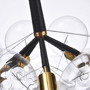 The Elderberry pendant is a spectacularly simple and modern designed pendant featuring clear glass globes, with Gold accents on a wrapped black frame. Install clear round lightbulbs to camouflage the light source in amongst the glass globes.