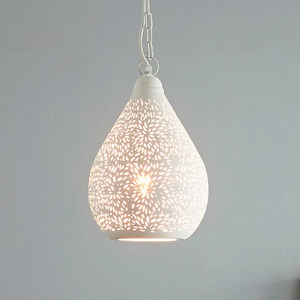 A modern take on the Moroccan style light, the Faiza pendant is an elegant teardrop shade. Perforated with a subtle floral pattern, light filters out through the shade to cast stunning shadows when placed near a wall.