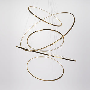 Manufactured from Stainless Steel with Titanium Gold electroplated finish, a backlit Opaque White acrylic diffuser to the inner surface of each ring, a premium SAA dimmable driver, and height adjustable up to 3m.