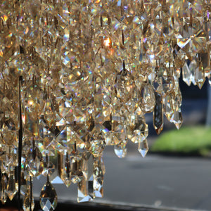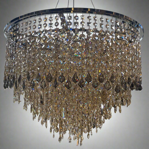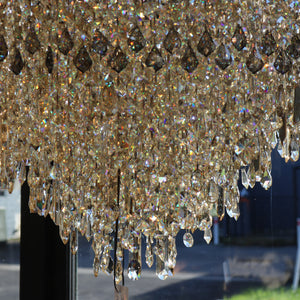 The Irina chandelier is a completely unique bespoke piece, designed and created at our Auckland showroom. Premium King Edward Champagne crystal with Smoke Grey accent crystals suspended from a slimline round Chrome frame.