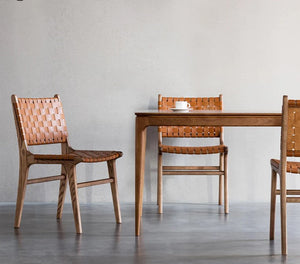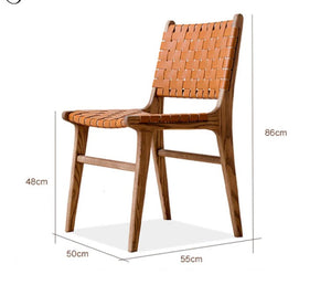 The Weavewood is a mid-century-inspired dining chair crafted with woven leather seat and back over a Walnut finished timber frame.