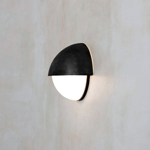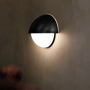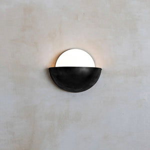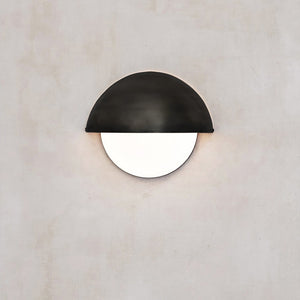 A simple, post-modern wall lamp with a Matt Black metal finish on the cover, with Opaque White glass diffuser. Can be rotated to face any direction, to light up a wall above or the space below.
