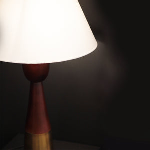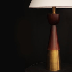 The Marcel table lamp features a tapering dark warm timber base with Antique Brass finish accent, paired with a White tapering shade. A modern rustic style that suits a broad range of interior styling. Shade included.