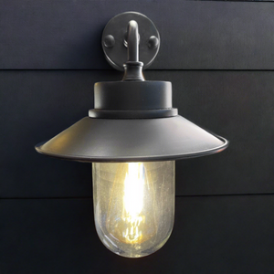 The Rogelio Wall Lamp is a simple yet elegant fitting, designed with a refined era in mind. It is certain to add to the complexity and sophistication of any home or office; inside or out. Solid Brass frame with Matt Black finish and handmade glass.