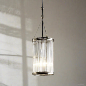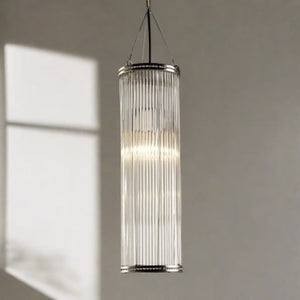 A sleek Art Deco pendant New York-inspired handcrafted with individual handmade glass rods with an electroplated Nickel finish.