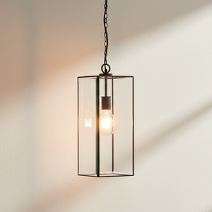 The Rustig is a simple, minimal pendant with delicate solid iron frame and beveled glass sides. This will add the finishing touch to any Hamptons or modern traditional space. Matt Black finish.