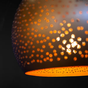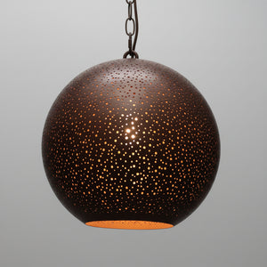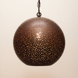 The Yasmine pendant light features a rounded dome shade in a Moroccan-inspired style. With handmade perforations glowing through the vintaged Antique Brass finish shade, the Yasmine pendant adds a soft dramatic effect to any space.