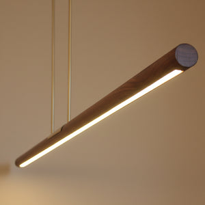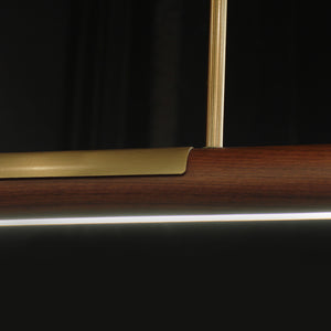 The Kazia Horizontal pendant light is from a range featuring branching horizontal bars of Black Walnut timber and integrated LED light. Brushed brass suspension rods.