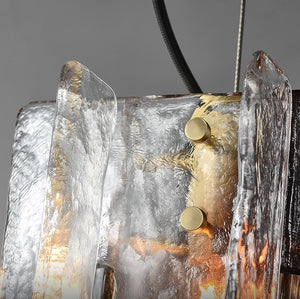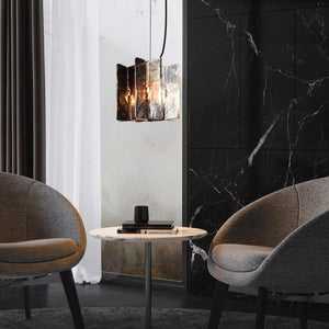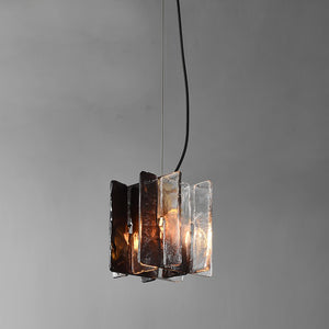 Gradia is a gradient glass pendant light, featuring intersecting textured hand-cast glass panels. The colour gradient ranges from clear glass to deep Smoke Grey across the pendant.