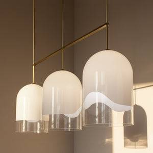 The Maja Triple pendant light features three stunning contemporary bell glass shades, with rippled Opaque White finish to the Clear glass. Featuring brushed Brass fittings and suspension rod, the Maja Triple pendant is a perfect choice for over the dining table or kitchen bench.