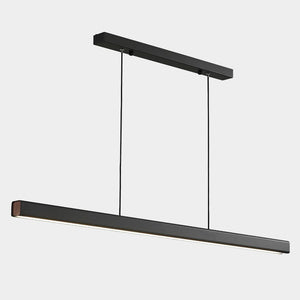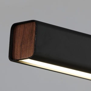 A sleek minimalist horizontal pendant, with rounded rectangular black aluminium profile and walnut-look contrast ends. This pendant is ideal for over bench tops and desks, with LED light emitted down through an opaque acrylic diffuser.